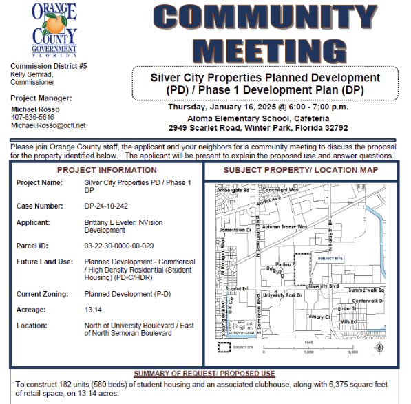 The community is invited to attend an upcoming meeting to discuss the proposed Silver Springs Planned Development, located at the intersection of North University Blvd and North Semoran Blvd. This project includes plans for over 182 units of student housing, along with mixed-use retail spaces, designed to benefit Full Sail students and the surrounding community.