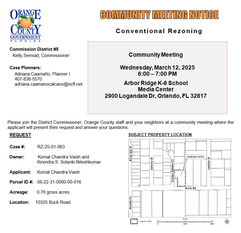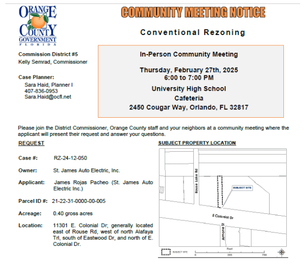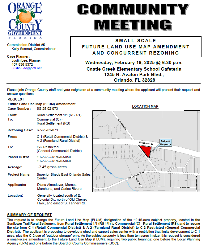 Orange County District 5 invites residents to attend a community meeting to discuss a proposed conventional rezoning request. The proposal seeks to rezone property from C-1 (Retail Commercial District) to C-2 (General Commercial District) to allow for outdoor storage of equipment, such as dryers and fans.