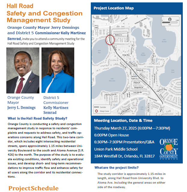 Orange County is conducting a Safety and Congestion Management Study to address residents’ concerns about traffic operations and safety along Hall Road. This two-lane corridor, spanning approximately 1.15 miles from University Boulevard to Aloma Avenue (S.R. 426), includes eight intersecting residential streets. The study aims to assess current conditions, identify key safety and operational challenges, and develop both short-term and long-term solutions to improve traffic flow and enhance safety for all users in the area.