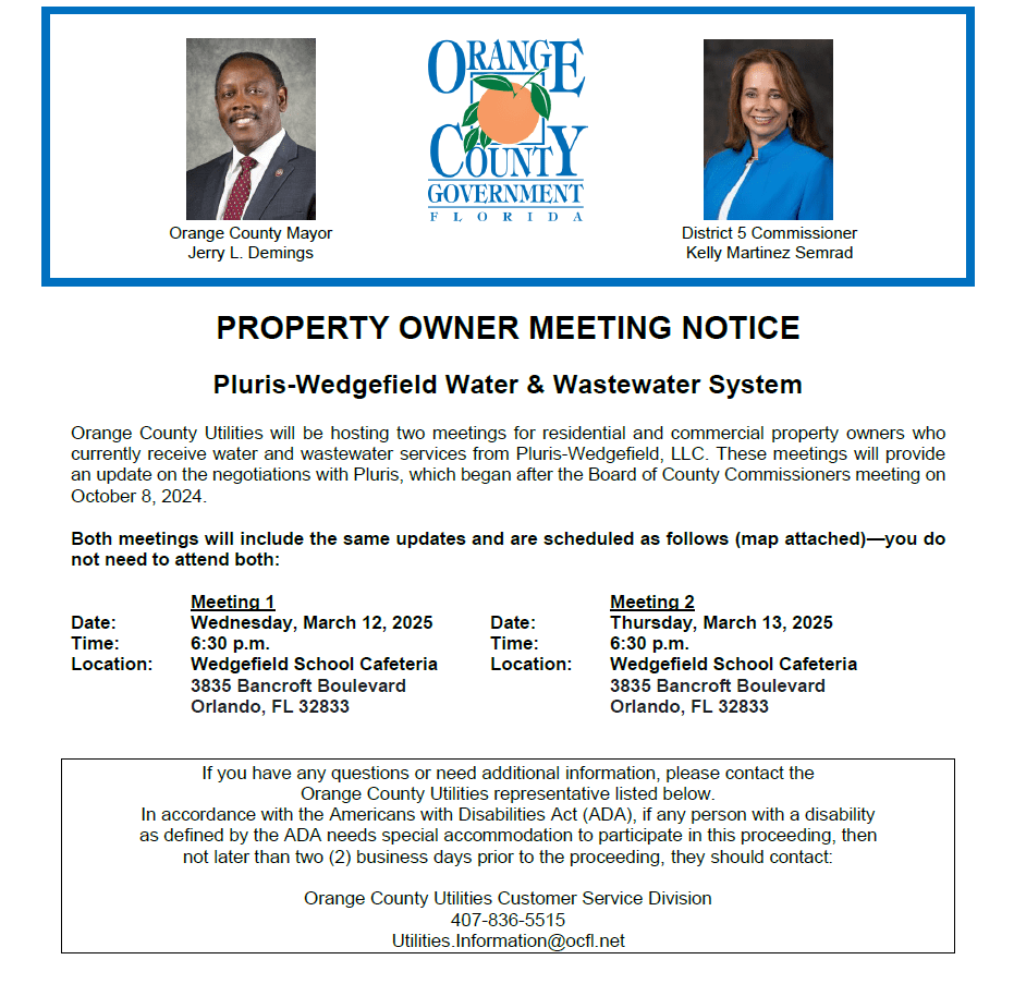Orange County Utilities will be hosting two meetings for residential and commercial property owners who currently receive water and wastewater services from Pluris – Wedgefield, LLC. These meetings will provide an update on the negotiations with Pluris, which began after the Board of County Commissioners meeting on October 8, 2024. Both meetings will include the same updates and are scheduled as follows (map attached)—you do not need to attend both.