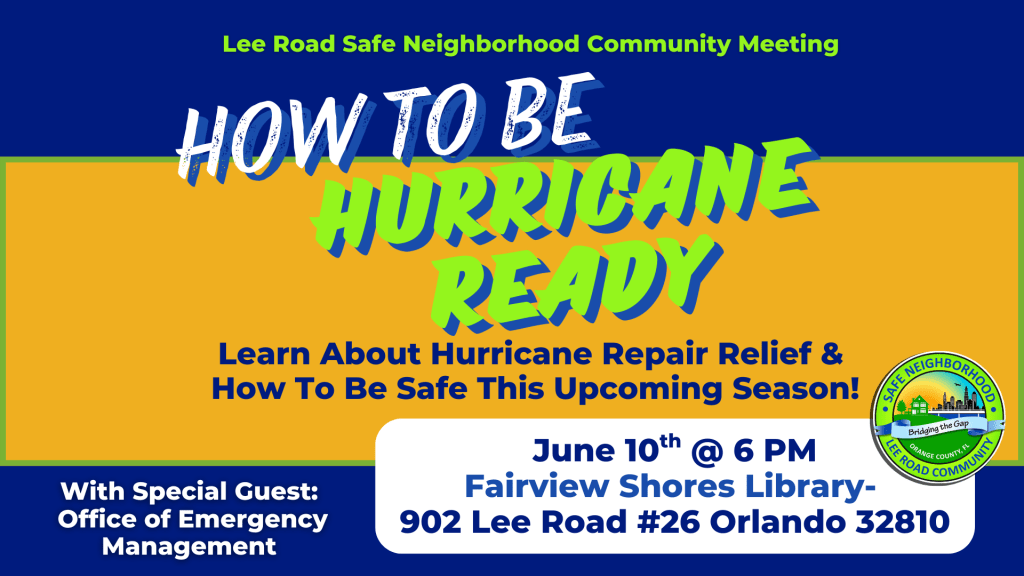 Join the Lee Road Safe Neighborhood meeting for a discussion no how to be prepared for Hurricane season and information about the Orange County RECOVERS program which provides funding for post-storm home repairs.